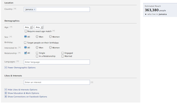 “Relationship”. The number that appear will give you the Estimated Reach of your Jamaican audience on Facebook, which currently stands at 363,380 people as of Sunday August 29th, 2010. This number tells you how many people who live in Jamaica and are on Facebook.