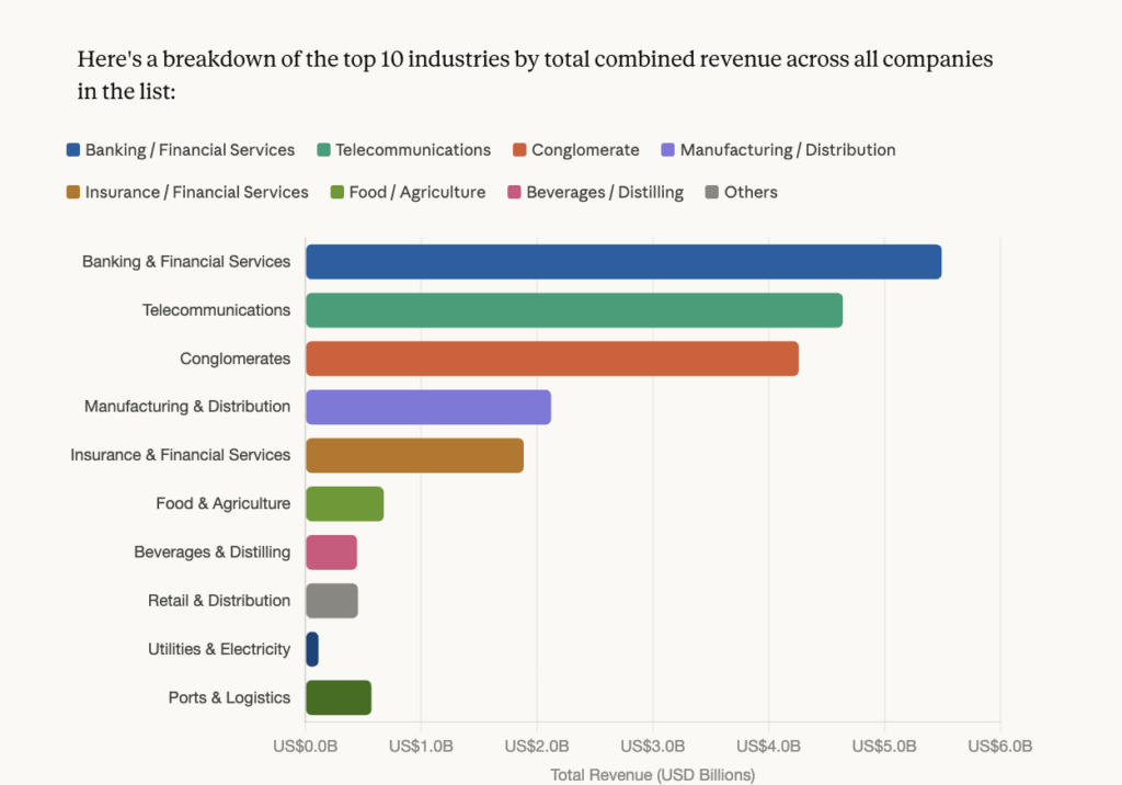 The clear takeaway: Finance and Telecoms dominate the Caribbean corporate landscape, with Jamaica and Trinidad & Tobago producing the most companies on this list.
